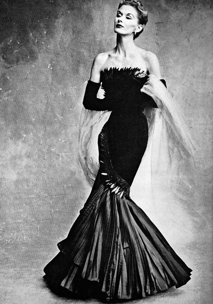 Lisa Fonssagrives vestido um vestido sereia desenhado por Marcel Rochas, 1950. [Imagem: Irving Penn/Vogue]