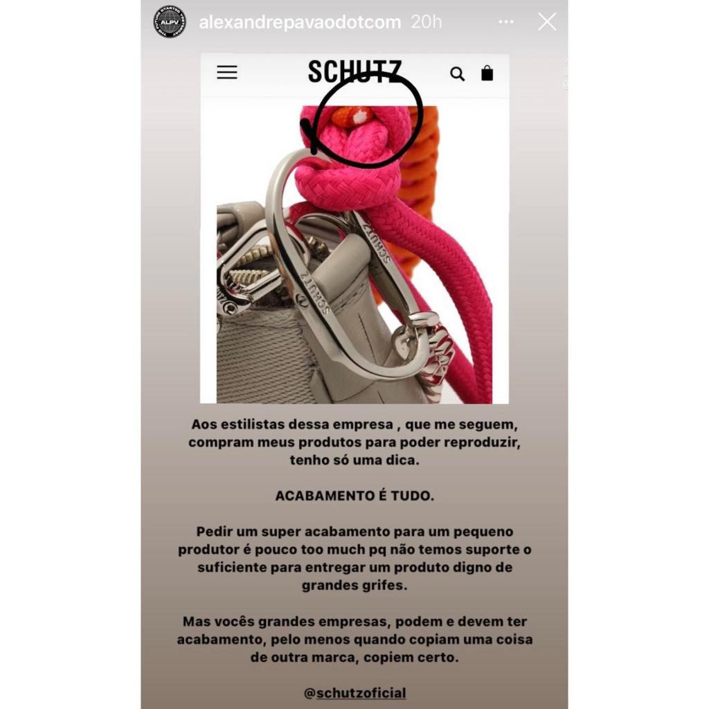 Em Novembro de 2020, a marca de acessórios independente brasileira assinada por Alexandre Pavão compartilhou em sua conta na plataforma no Instagram as semelhanças entre seu trabalho autoral e manual com a coleção recém-lançada da época da marca Schutz, a reação do público foi extremamente positiva e acabou trazendo a marca para um plano principal de mídia, o trabalho de Pavão falou por si mesmo e deixou inúmeros amantes de moda apaixonados por seu trabalho se tornando uma das marcas mais especiais e conhecidas da moda brasileira moderna.