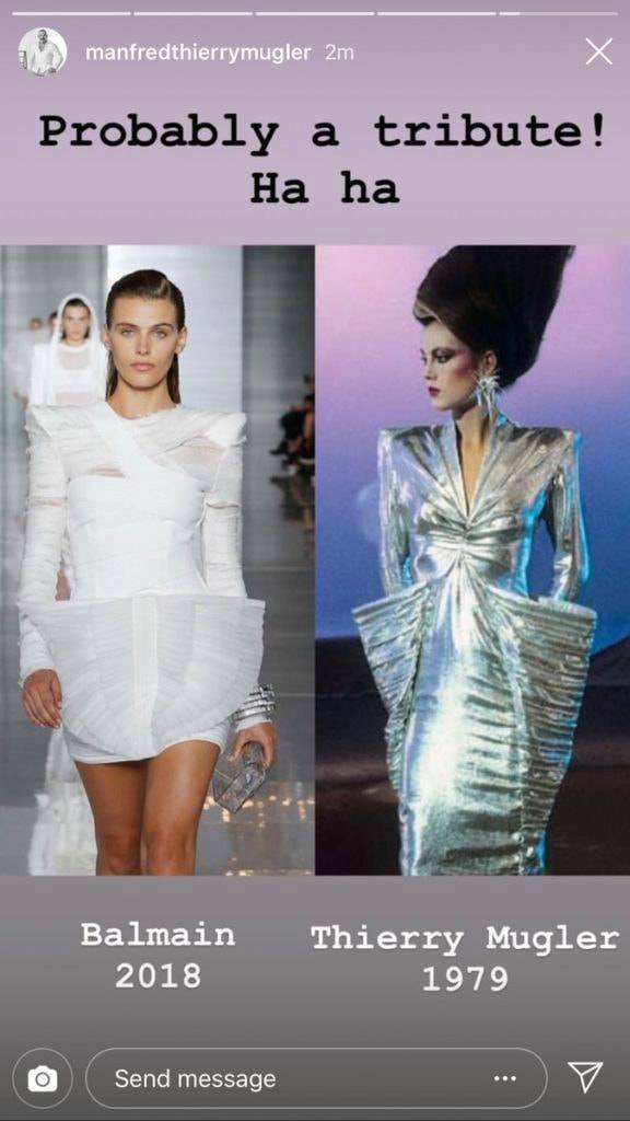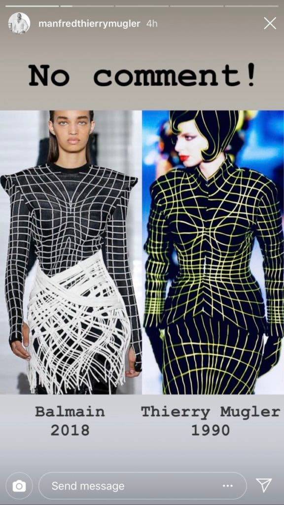 Em outubro de 2018, o aposentado designer francês Thierry Mugler utilizou o seu instagram para acusar Olivier Rousteing, diretor criativo da francesa Balmain, de plágio em sua coleção de Primavera/Verão de 2019. Através de seus stories 一 recurso da rede instagram para compartilhamento de mídias 一, Mugler fez diversas comparações da coleção apresentada por Olivier com suas criações passadas.