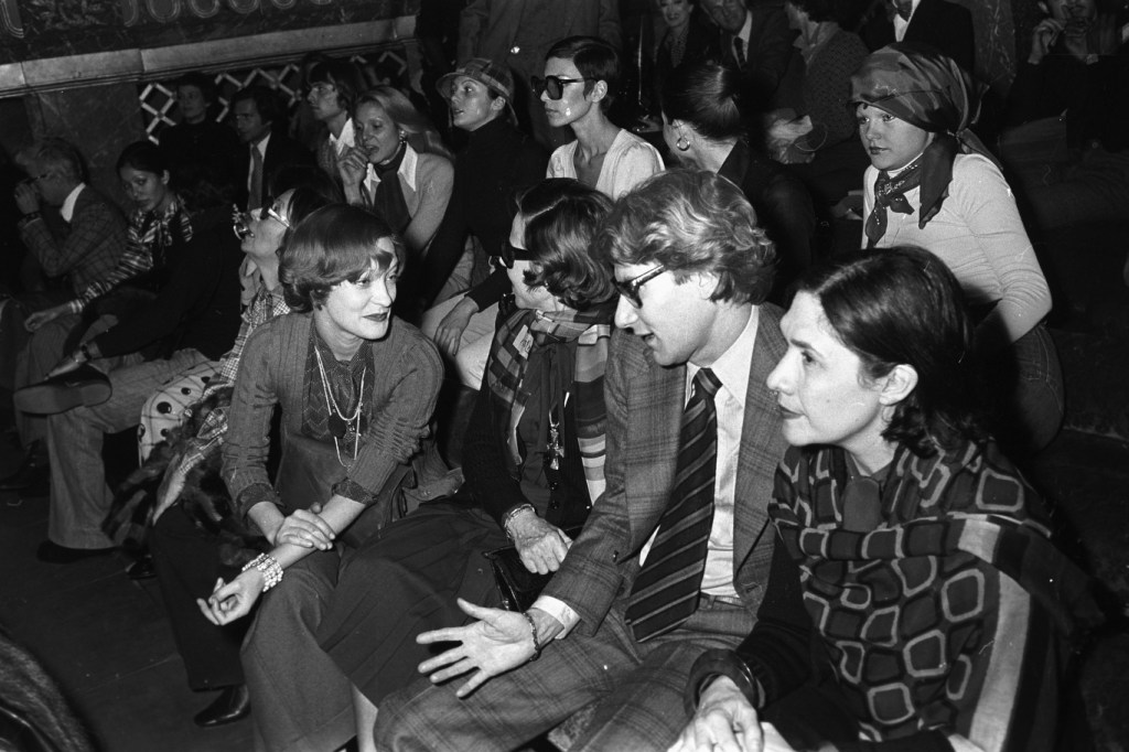 Yves Saint Laurent, Loulou de la Falaise e amigos que compareceram ao desfile em benefício à manutenção do Castelo de Versalhes em 28 de novembro de 1973. [Imagem: Fairchild Archive/Penske Media/Shutterstock]