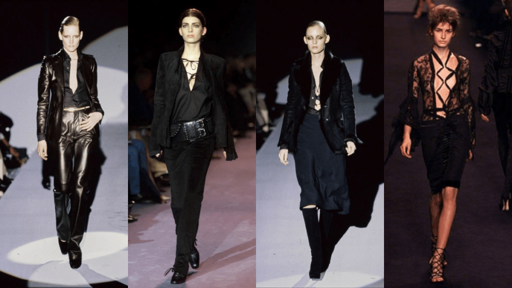 Tom Ford revolucionou não só a grife como também a moda da década. Deixa clara a sua visão criativa na coleção de Outono/Inverno 1995 com silhuetas acentuadas, diferentes das sem forma comuns na época; decotes fundos; cortes que remetem aos anos de 1970; cores ousadas e ricas; texturas e veludo — isso sem esquecer a identidade da marca. Basicamente: a sensualidade dominava a passarela. As modelos usavam olhos esfumados, cabelos selvagens à la pós sexo e até o caminhar era sexy e provocativo.