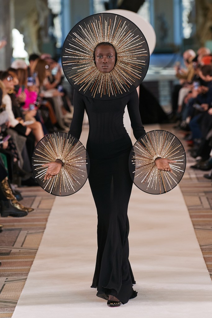 Daniel Roseberry conversou sobre com o jornalista Anders Christian Madsen “Existe essa palavra em francês para quando você está dirigindo em um penhasco e sente uma vontade repentina de sair da estrada. É chamado de ‘o chamado do vazio”’, disse ele durante uma prévia no dia anterior. “Acho que foi assim que senti o espaço”, explicou ele cercado por vestidos orbitais e bolsas planetárias em seus salões Place Vendôme. “O vazio é a ausência dessa realidade.”