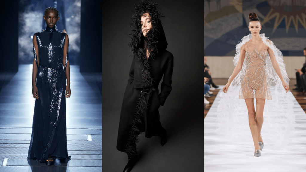 Além de um olhar moderno e muito bem executado sobre o visual de festas para agora em diante, um sexy velado, com recortes estratégicos, plumas, capas e vestidos turquesa cobertos de cristais. A marca trás um diálogo sobre a mulher moderna, que usaria um terno ou plumas para trabalhar até a noite de festa, e ninguém sabe vestir para uma noite em claro como Alexandre Vauthier.