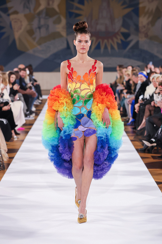 Encerrando a semana de alta-costura e fazendo sua estréia oficialmente no calendário como membro da comunidade, a marca da russa Yulia Yanina apostou em uma paleta de cores totalmente colorida 一 paleta na qual faz uma referência às cores do arco-íris 一 variando entre tons vibrantes e mais pastéis, além do uso preciso da transparência e leveza na maioria de suas peças. Apesar dos esforços de Yanina em encerrar a semana num espírito animador e vibrante, a única vontade verdadeira quando se olha para os enormes vestidos de tule em cores vibrantes – quase neons- de arco-íris é de fechar os olhos.