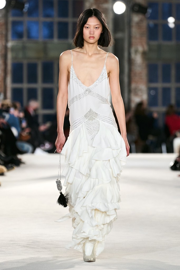 Nesta coleção não foi diferente, com o designer falando ao WWD sobre sua inspiração nas histórias e narrativas que retratam as festas e a liberdade dos anos 20 em Paris, com decotes em triângulo, cinturas baixas, camadas de chiffon nas bainhas e bordados, como por exemplo no primeiro look da coleção já conseguimos entender exatamente onde a inspiração foi.
