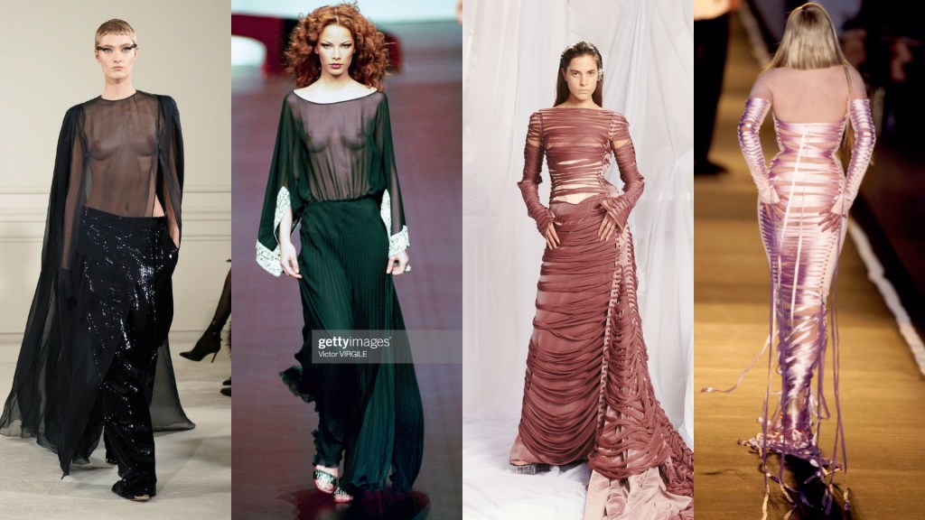 Com menções a coleções passadas, Glenn trouxe para as passarelas a força dos corsets – que além de serem marca registrada de JPG, vêm também marcados presenças como um trend recente. Trabalhos impecáveis com tules que envolvem e abraçam a silhueta, também esconde a face e traz volume dramático. Transparência nos lugares e dos jeitos certos.
