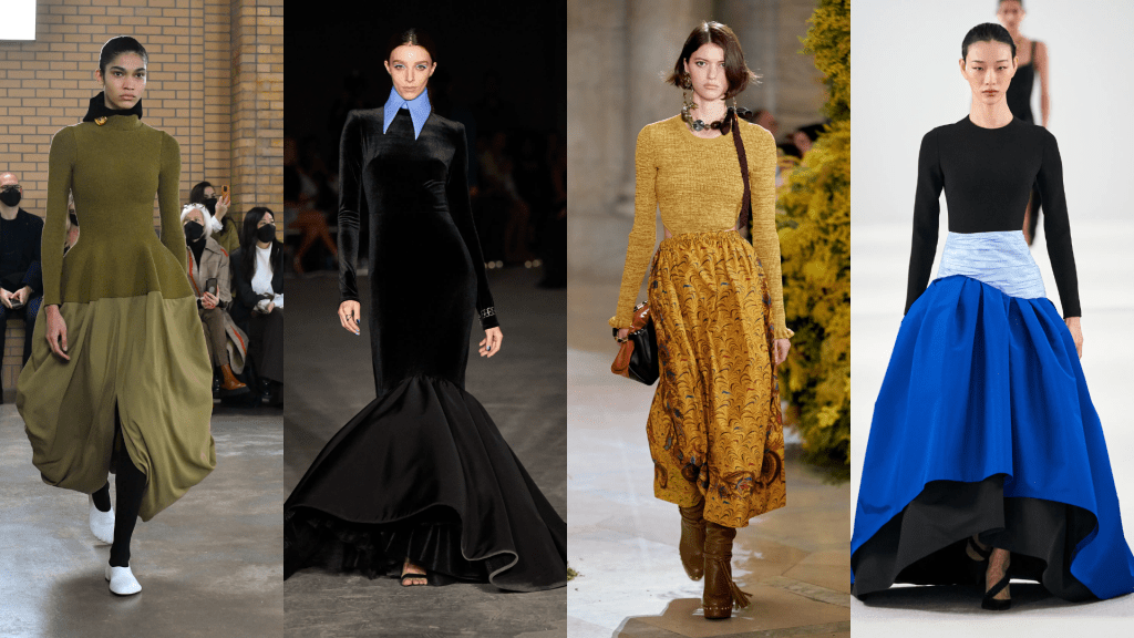 Mangas longas e tecido rente à pele na parte de cima é definitivamente a silhueta-tendência da temporada. Quase como uma segunda pele, ela é complementada por partes de baixo bem volumosas compostas majoritariamente por saias. Carolina Herrera e Ulla Johnson apresentaram modelos de blusa e saia separados, enquanto Christian Siriano e Proenza Schouler apostaram em vestidos que unem as duas peças em uma só. Talvez uma herança da tendência de proteção ligada à pandemia, o elemento traz uma certa modernidade chic e casual ao look.