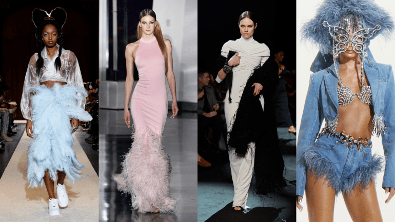 Usadas como adorno nas barras e nas laterais das peças, as plumas e penas seguem como tendência forte nessa temporada. Por mais que marcas como Area e Christian Cowan já tenham o material intrínseco no DNA da marca, o seu uso coincide com o de outras que não exploram tanto assim o material — como Brandon Maxwell e Tia Adeola. O grande ponto é a combinação desses motivos com a mesma cor da peça onde são aplicados, seguindo a tendência do monocromático tão presente nesta temporada.