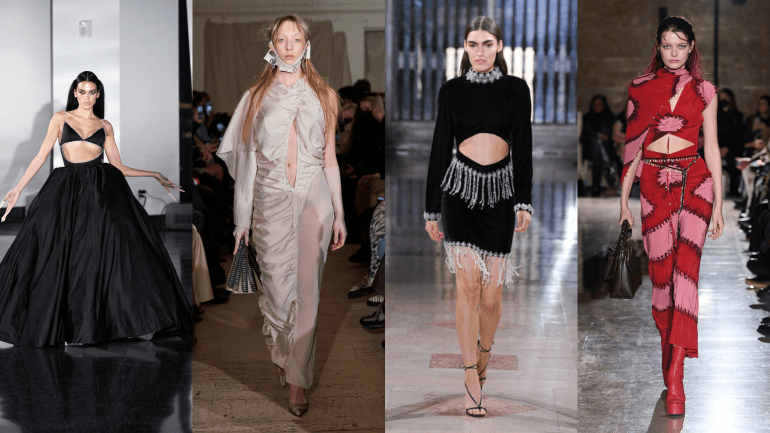 Os recortes estratégicos nas laterais e no torso migraram nesta temporada para a barriga. Marcas como PatBo, Altuzarra, Elena Velez e Christian Cowan foram algumas que decidiram exlorar a área, cada uma da sua maneira. Elena Velez se utilizou de um recorte mais fino, que chega até o umbigo e parece não imprimir tanta sensualidade quanto Cowan, que localiza a abertura logo abaixo do busto e a contorna com cristais. Já PatBo e Altuzarra costuram o recorte mais abaixo, acima da linha do umbigo.