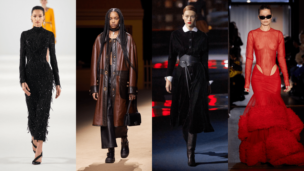 Numa tentativa de se aventurar em novos matizes. Que se afasta dos verdes e amarelos vividos apresentados na sua coleção de Primavera/Verão 2022 e explora a feminilidade encontrada no rosa pink, vermelho e roxo; e a sensualidade embutida no preto, branco e marrom hickory.