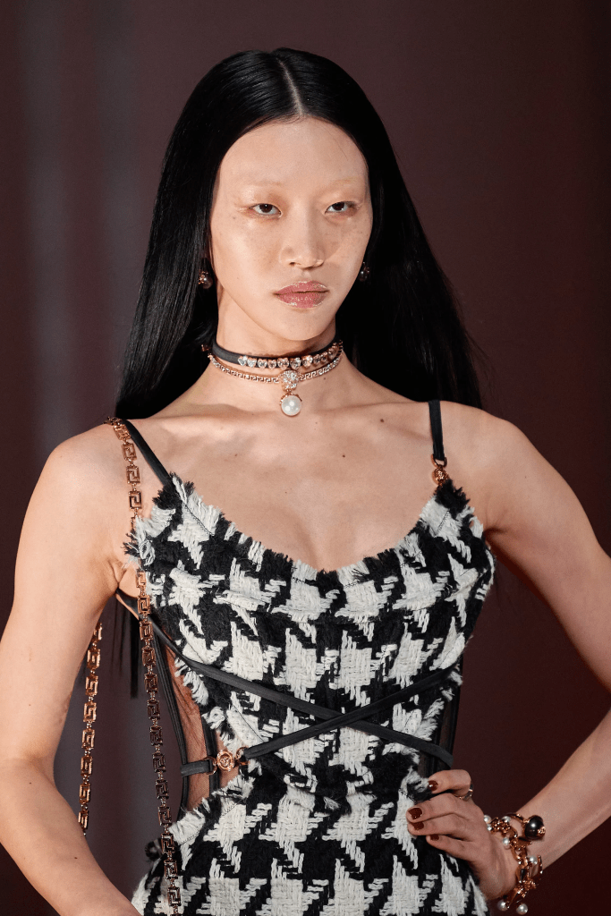 Ainda na linha do gráfico, a Versace foi um dos grandes destaques de Beauty da MFW. Liderado pela dupla querida do mês da Moda, Pat McGrath e Guido Palau, o look Versace teve as sobrancelhas platinadas presentes nos produções mais alternativos dos anos 90, fazendo um interessante contraste com olhos super marcados, a la Julia Fox (que vale destacar, teve seu seu visual criado por Daniel Kolaric, maquiador da equipe de McGrath, e se utilizou de referências criadas e passadas pela própria Pat. Sem coincidências aqui). O cabelo é o super liso repartido já visto em outros shows da casa.