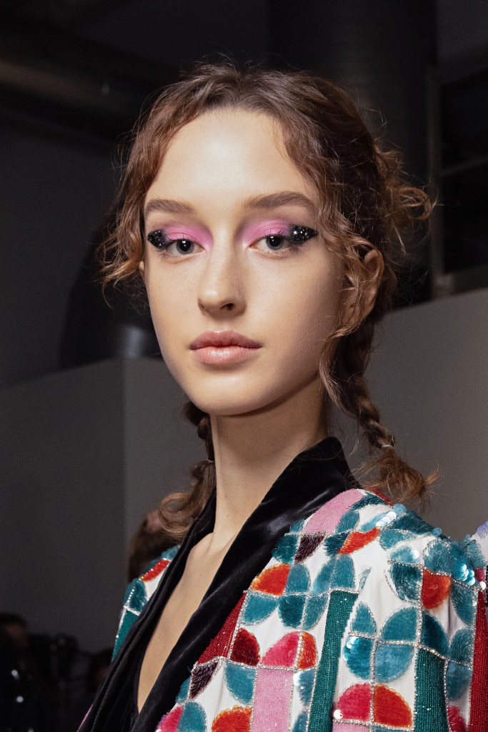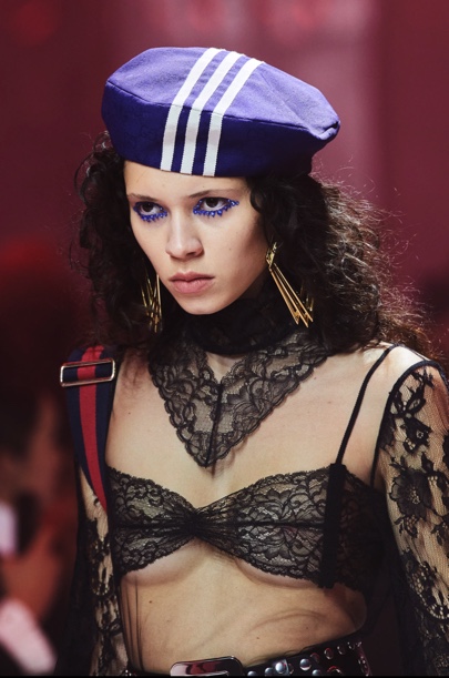 Thomas de Kluyver, consultor global de maquiagem da Gucci, descreveu seu trabalho nessa temporada como brincalhão, divertido, irrestrito e não clássico. A grife, que lançou sua collab inédita com a Adidas, aproveitou elementos presentes em muitos outros desfiles da temporada, como olhos e boca marcados, e pele iluminada. Porém com vivacidade, brilhos, pedras, resultando em uma interpretação única às tendências.