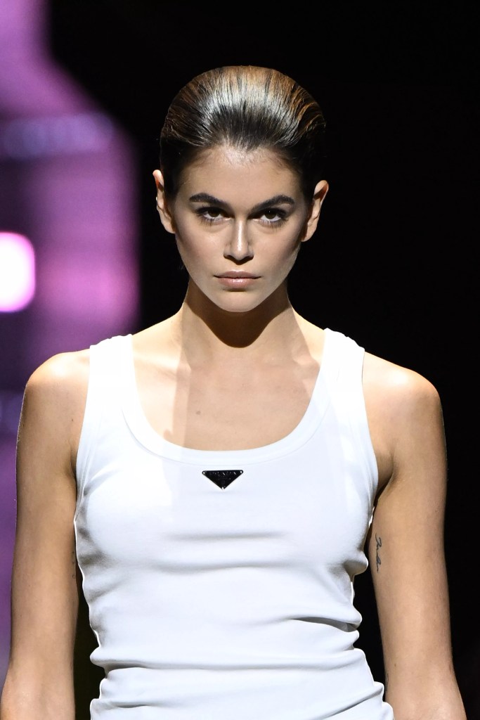 Palau também levou o wet hair para a Prada numa proposta mais noventista, que misturou o coque clássico e o minimalismo pedido por Miuccia Prada e Raf Simons, com referências futuristas e arquitetônicas vistas no volume do penteado e acabamento. Tudo combinado com a proposta, também futurista, da maquiagem de Pat McGrath: iluminada, leve e muito natural.