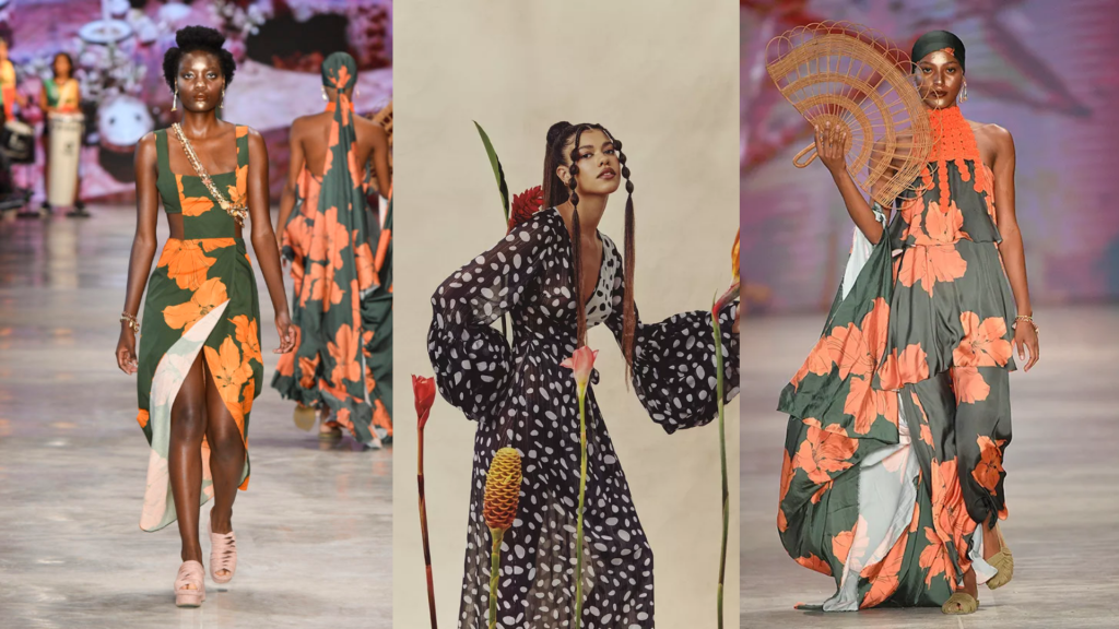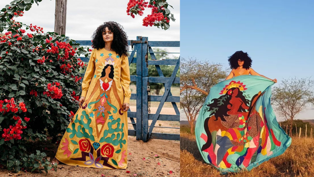 Mônica Sampaio é a mente por trás da Santa Resistência, marca pensada a partir da estética afro-brasileira e das memórias infantis da fundadora, que é natural do Recôncavo Baiano. O samba, o Candomblé e o famoso Rio Paraguaçu são algumas das inspirações para as suas coleções. Hoje radicada no Rio de Janeiro, Mônica faz parte da nova geração de mulheres negras que estão construindo novas narrativas e imaginários sociais — ela criou sua marca aos 45 anos de idade, depois de ter trabalhado anos em multinacionais e até no exército brasileiro.