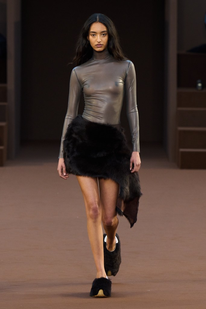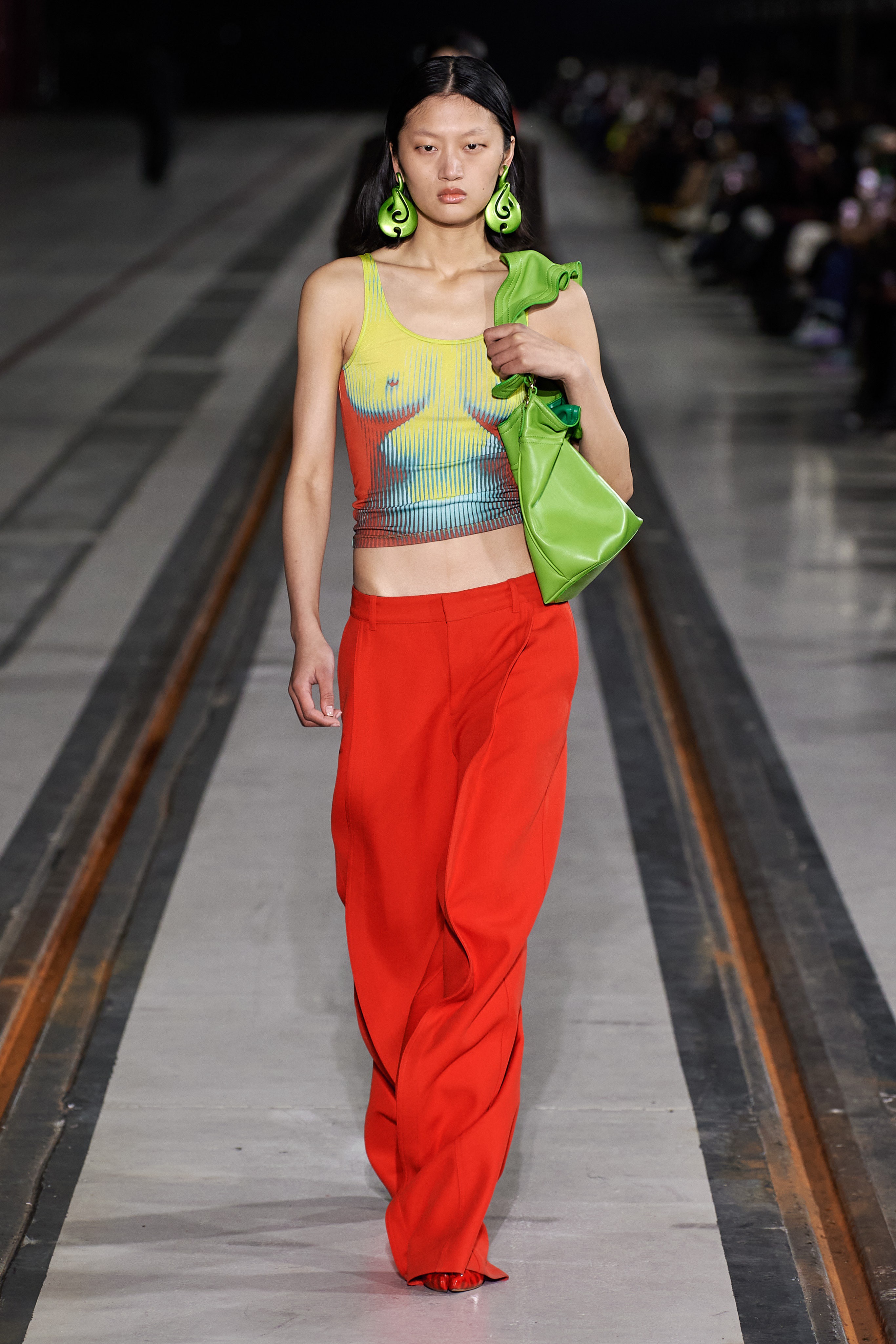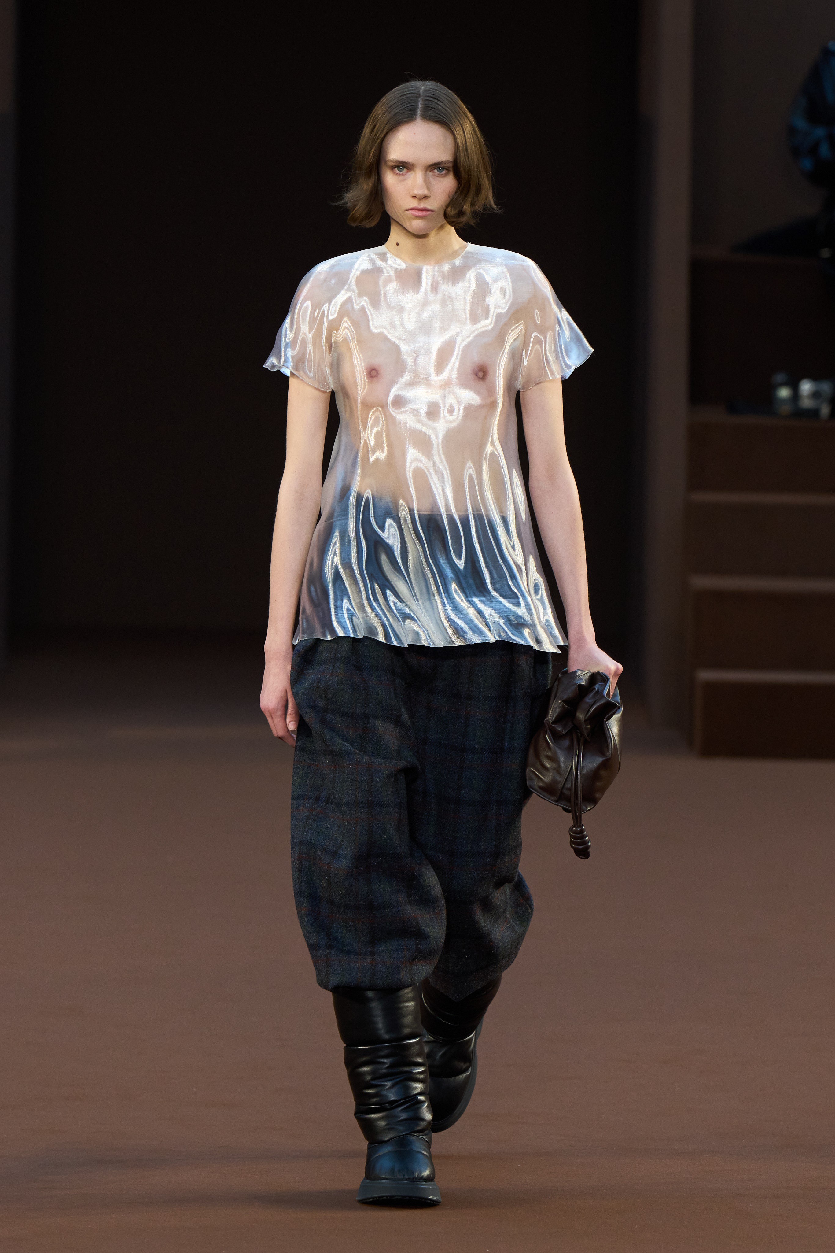 Já Isabel Marant na sua coleção de outono-inverno 2022, aderiu à transparência com uma peça manga longa e gola alta feita de rede repleta de cristais, assim como no desfile da Ludovic de Saint Sernin. Os cristais e brilhos têm feito presença há algumas temporadas. Unir ambas tendências fez com que os telespectadores do desfile vibrassem com o looks que contemplava uma calça cargo que quase passou despercebida fazendo dupla com a blusa de cristais.