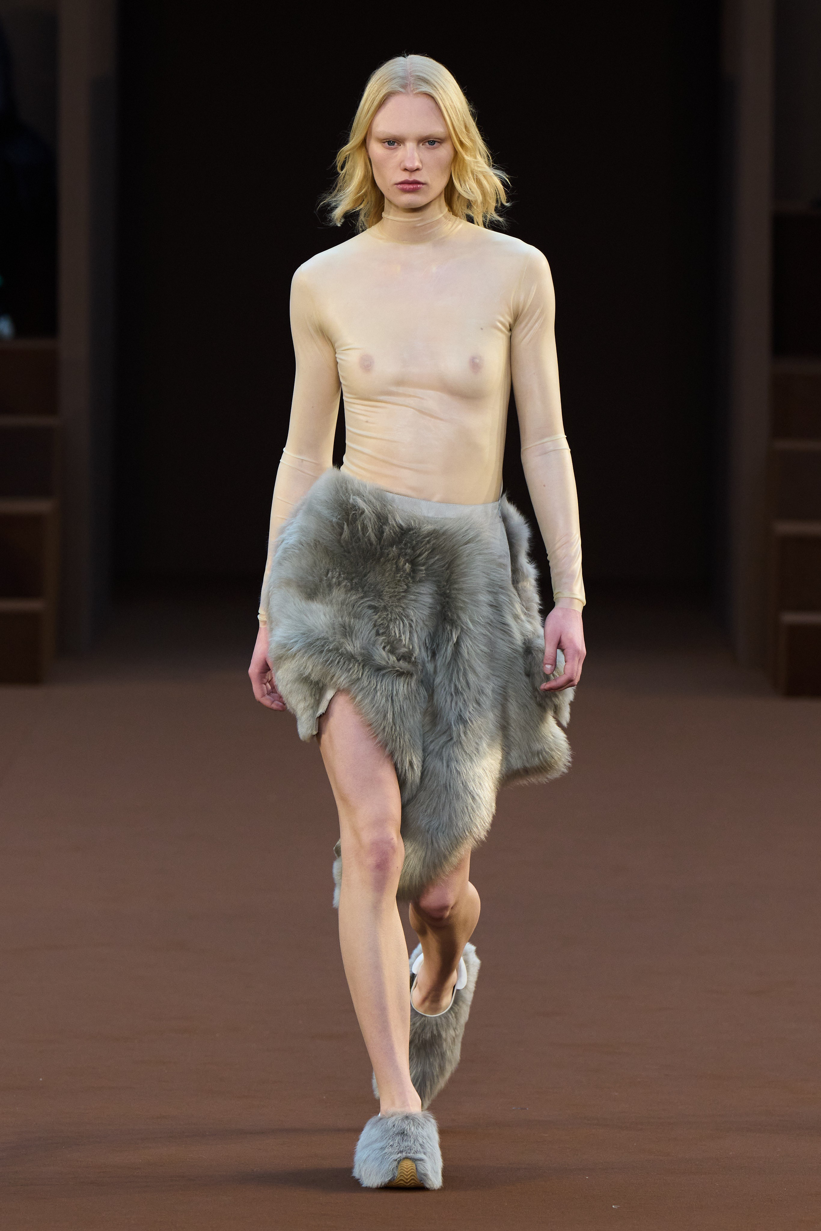 A Loewe, dirigida por JW Anderson, na última coleção de outono-inverno 2022, enviou como parte dos convites para seu desfile um ‘lenço’ de látex quadrado, que foi usado por alguns jornalistas como cachecol no momento da apresentação. Mesmo que a casa espanhola seja tradicional com seus fundamentos como uma casa baseada em couro, dessa vez, além dele, utilizou do plástico líquido para desenvolver as peças de blusas firmes nos corpos que eram transparentes.