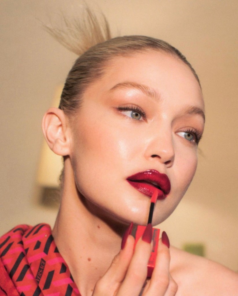 A segunda trend na qual Hadid investiu para o baile é também um hit dos anos 90: o batom glossy em tom de vermelho sangue foi utilizado em conjunto com um lápis em tom mais escuro para delinear os lábios, chamando mais atenção para a boca.