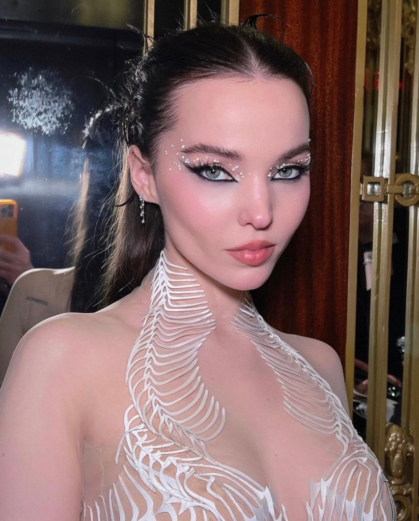 Complementando um look Iris Van Herpen inspirado pelos minuciosos bordados feitos nas roupas no século 18, a cantora Dove Cameron apostou nas jóias como foco da beleza e um penteado semi-preso com raízes bem lisas.