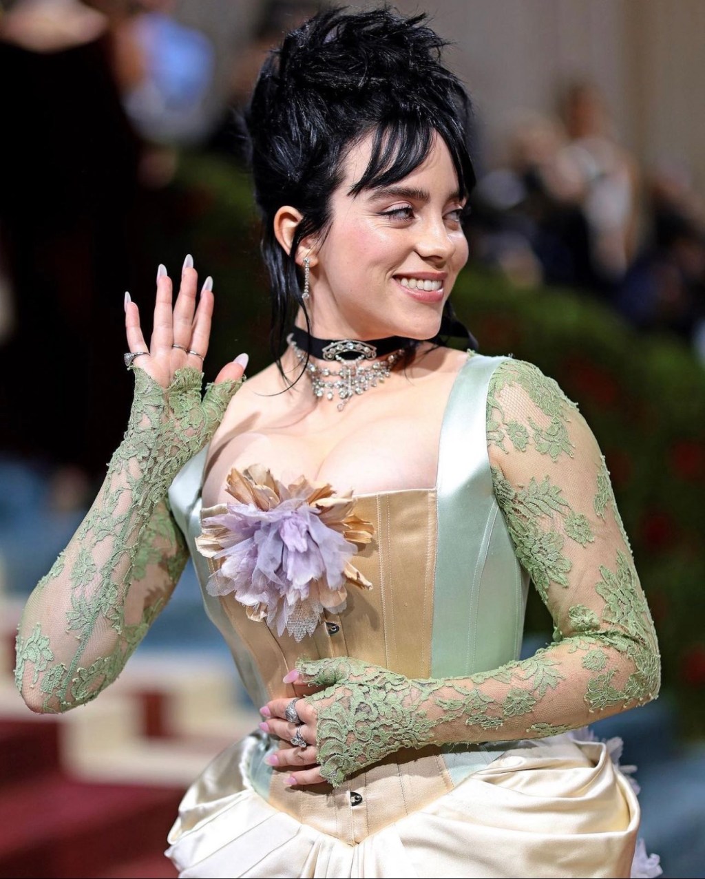 Inspirada pelo retrato de Madame Poirson, de 1885, Billie Eilish apostou em uma beleza natural mas não menos marcante: a pouca maquiagem se assemelhava às mulheres da época, e o penteado em coque com mechas soltas entregou ao look ares góticos.