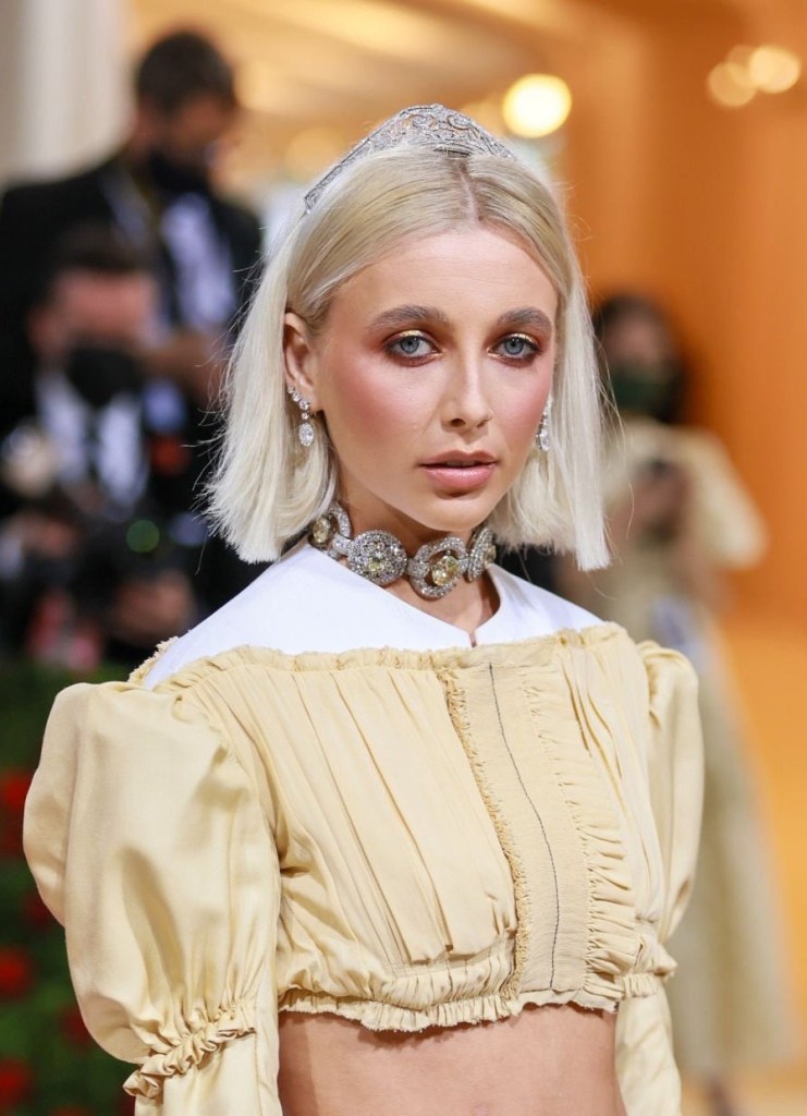 YouTuber e influencer queridinha das fashion girlies, Emma Chamberlain surpreendeu ao chegar a escadaria do Met em um look Louis Vuitton, com grandes jóias e uma recente descoloração no cabelo.
