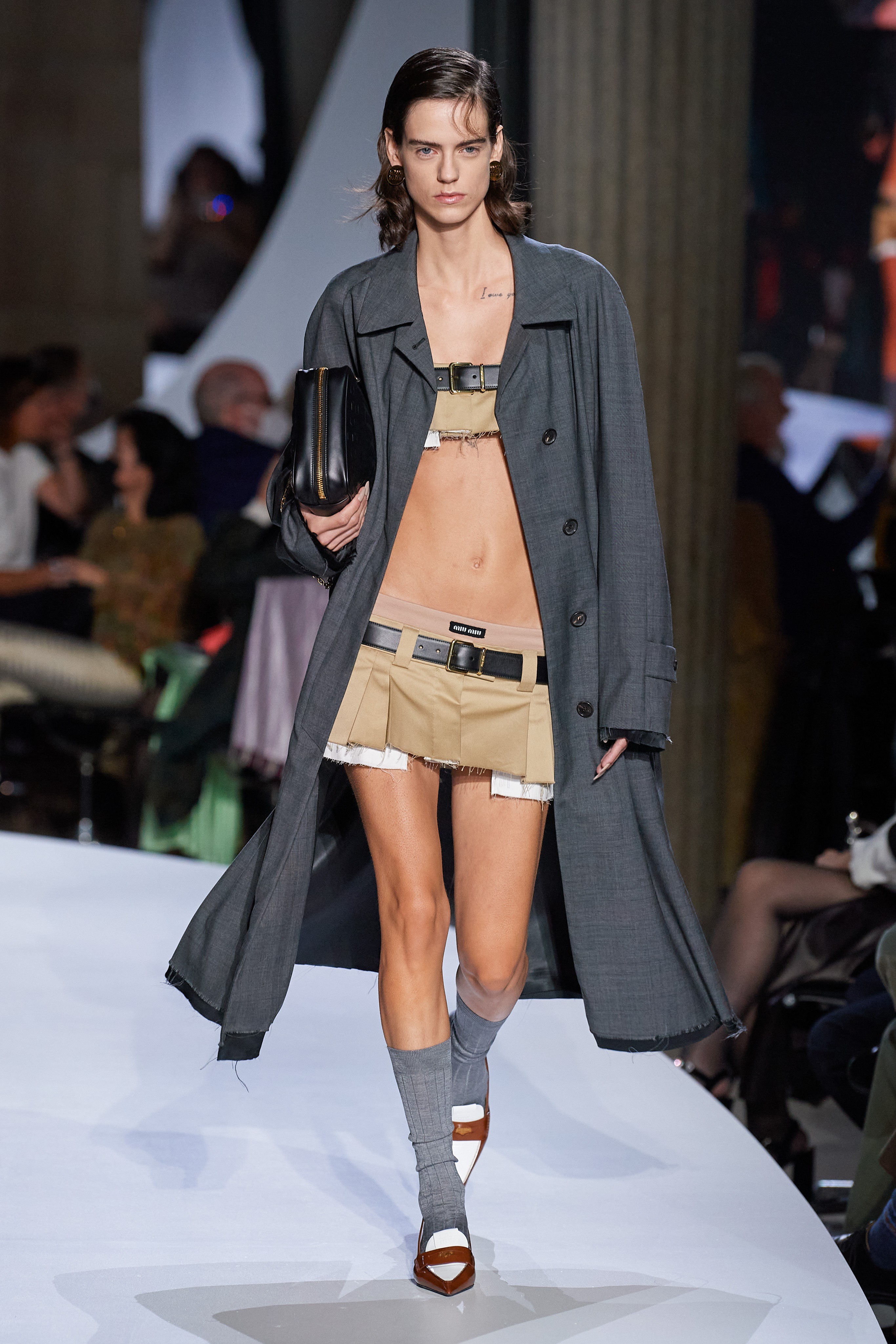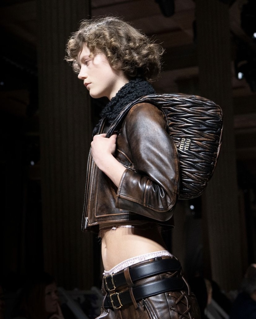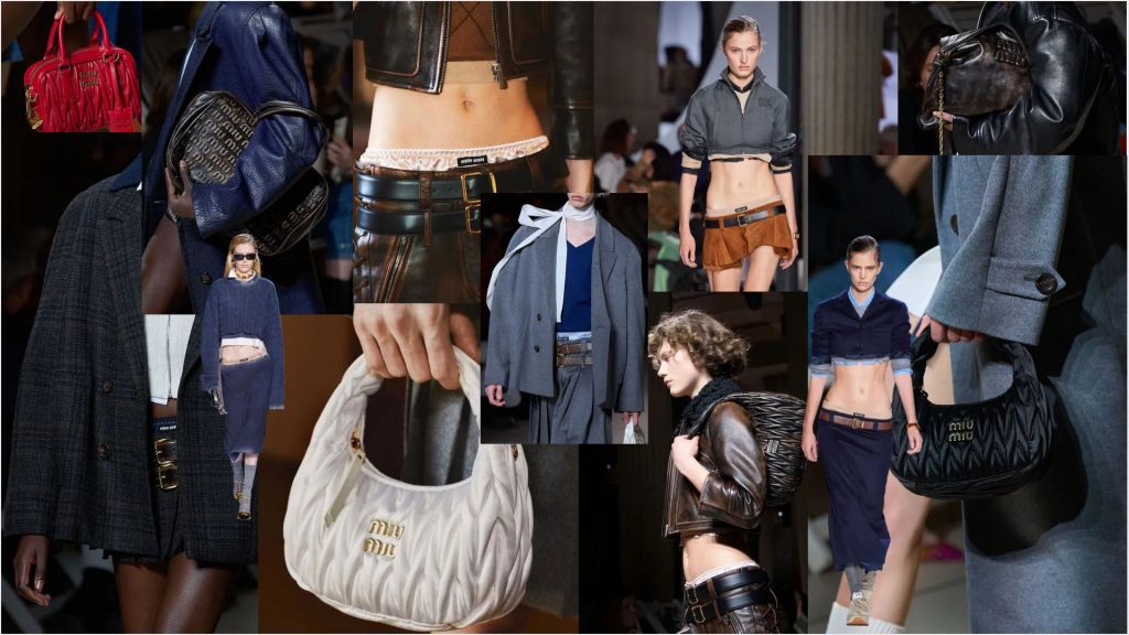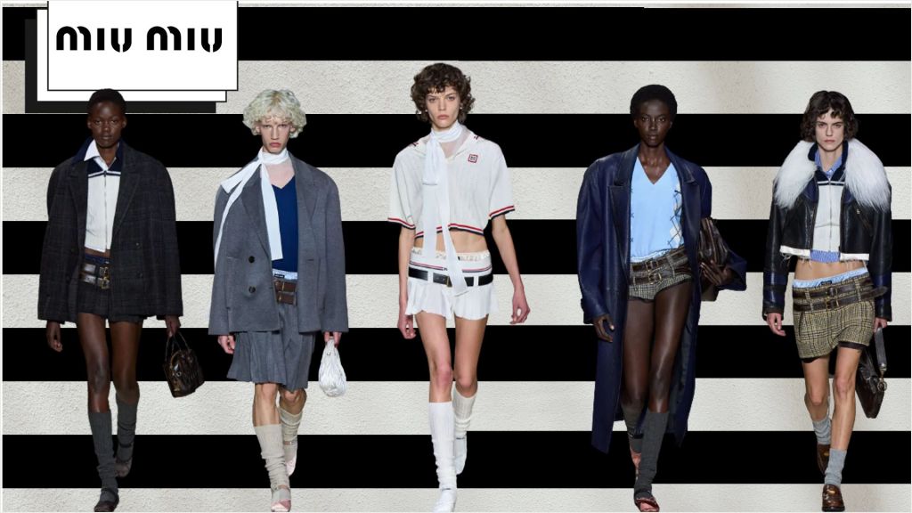 Inspirada especialmente na rebelião e espírito vanguardista do público juvenil, principalmente pelo recorte das peças que relembram os uniformes escolares/universitários cortados, a apresentação da coleção de Primavera da Miu Miu é marcada pela presença de símbolos que retomam as referências aos gloriosos anos 2000 — anos estes de glamour e fortemente característico pela expressividade e mistura de detalhes e elementos nas vestimentas —, como as mini-skirts, peças em cintura baixa, e especialmente, amostra da pele.