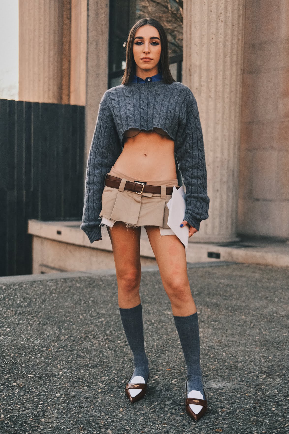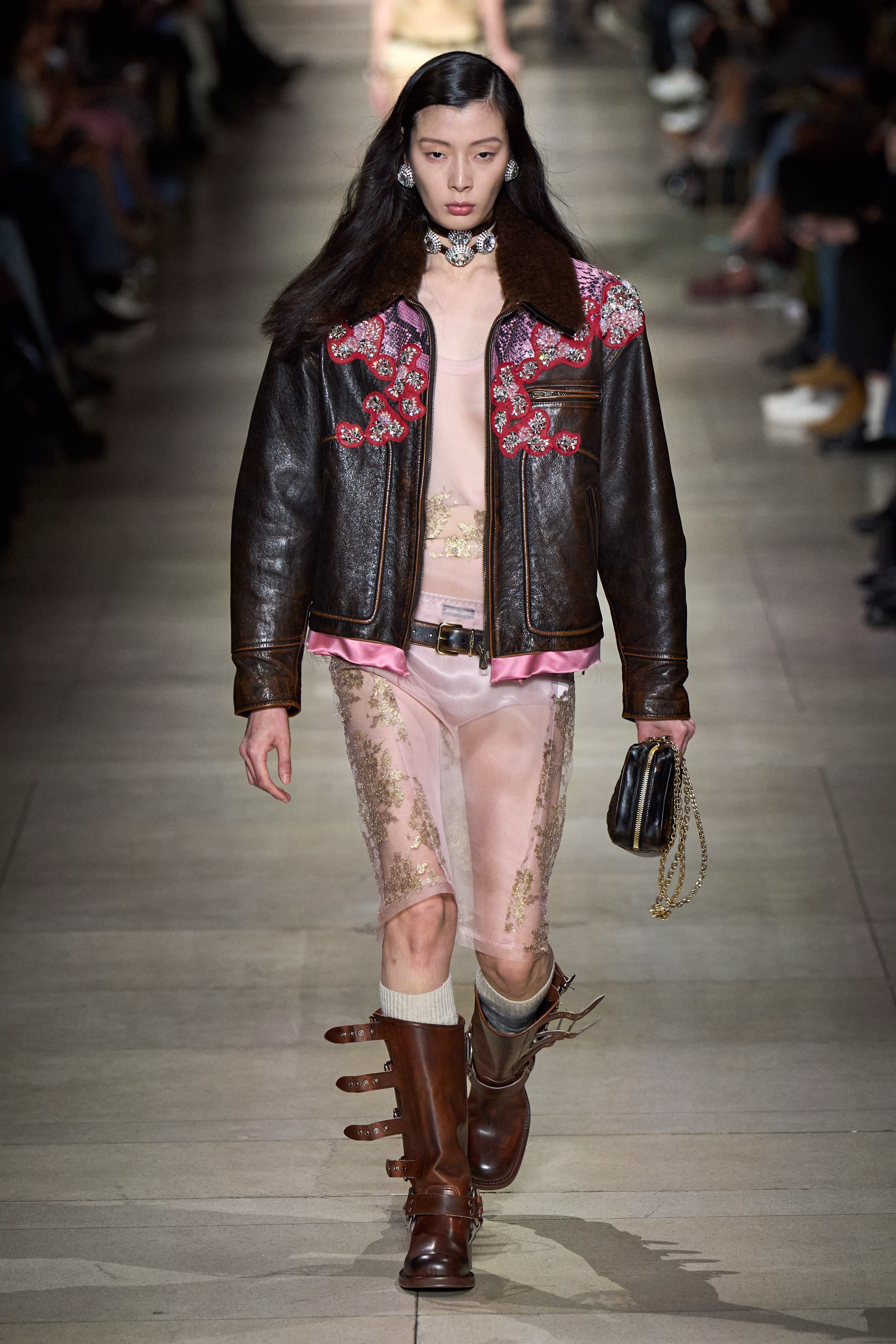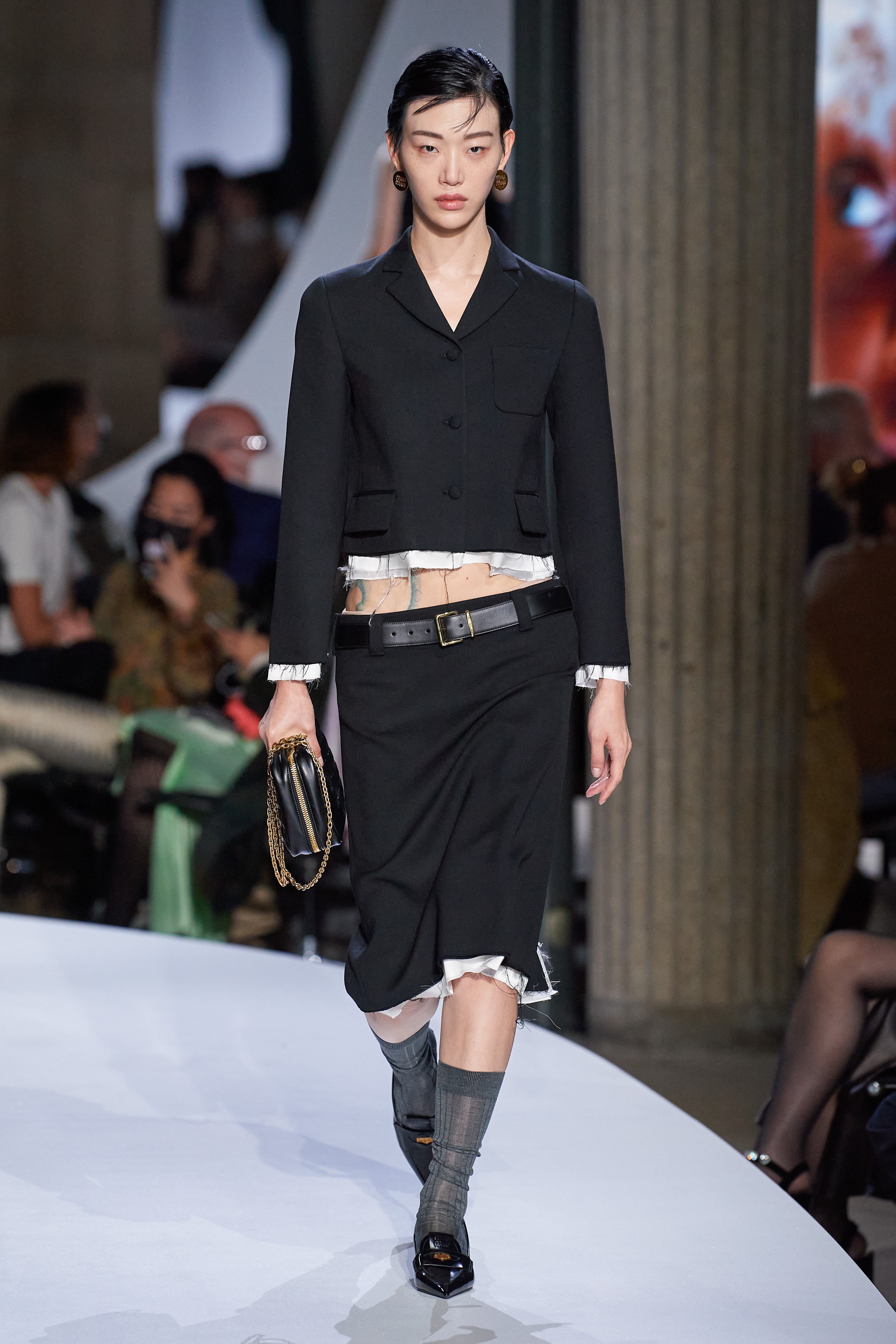 Inspirada especialmente na rebelião e espírito vanguardista do público juvenil, principalmente pelo recorte das peças que relembram os uniformes escolares/universitários cortados, a apresentação da coleção de Primavera da Miu Miu é marcada pela presença de símbolos que retomam as referências aos gloriosos anos 2000 — anos estes de glamour e fortemente característico pela expressividade e mistura de detalhes e elementos nas vestimentas —, como as mini-skirts, peças em cintura baixa, e especialmente, amostra da pele.