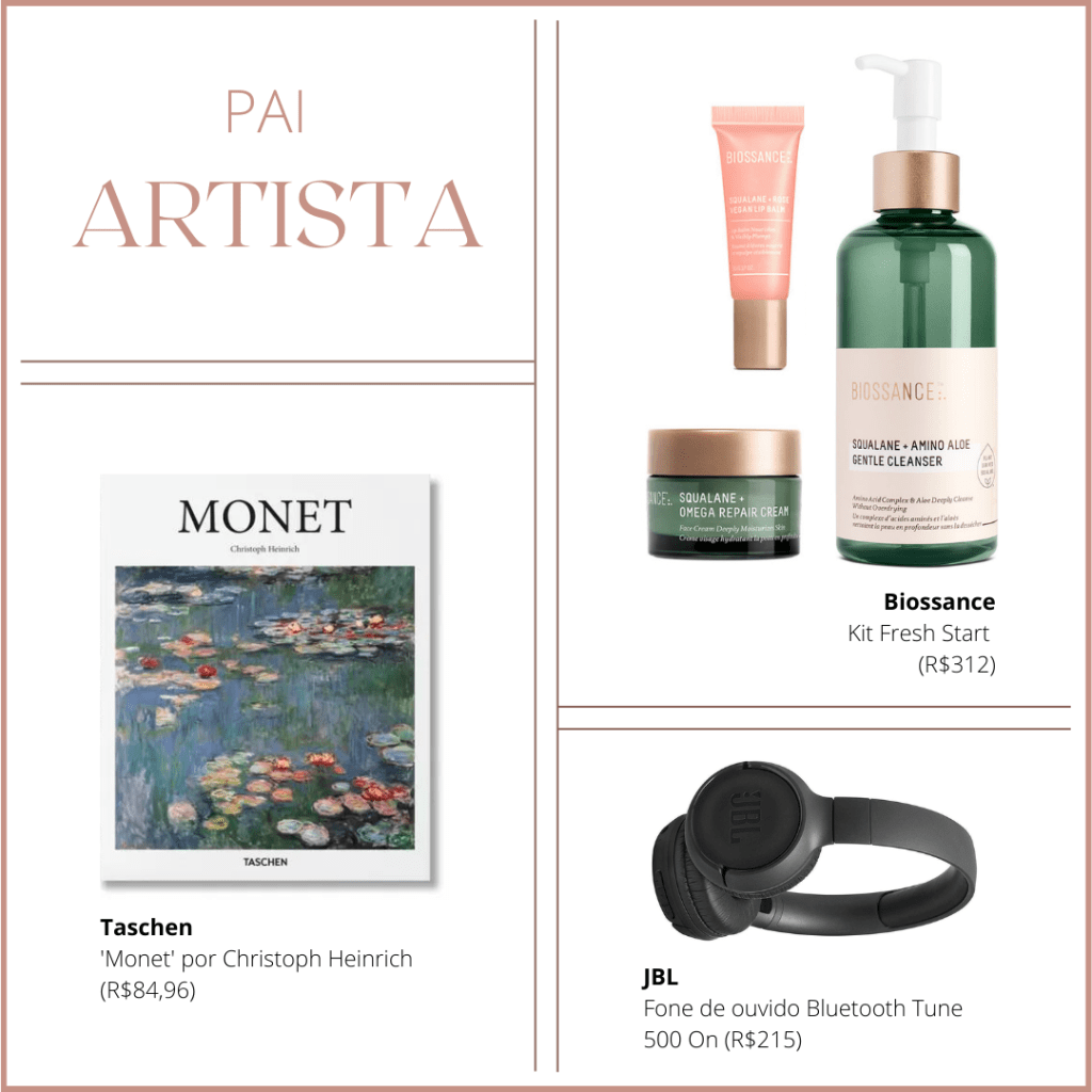 O pai Artista sempre terá as melhores indicações de filmes, músicas e até aquele livro perfeito pra te tirar da ressaca literária. Para presentá-lo, aposte em coffee table books, itens de auto cuidado ou caixas de som/fones de ouvido. Sucesso na certa!