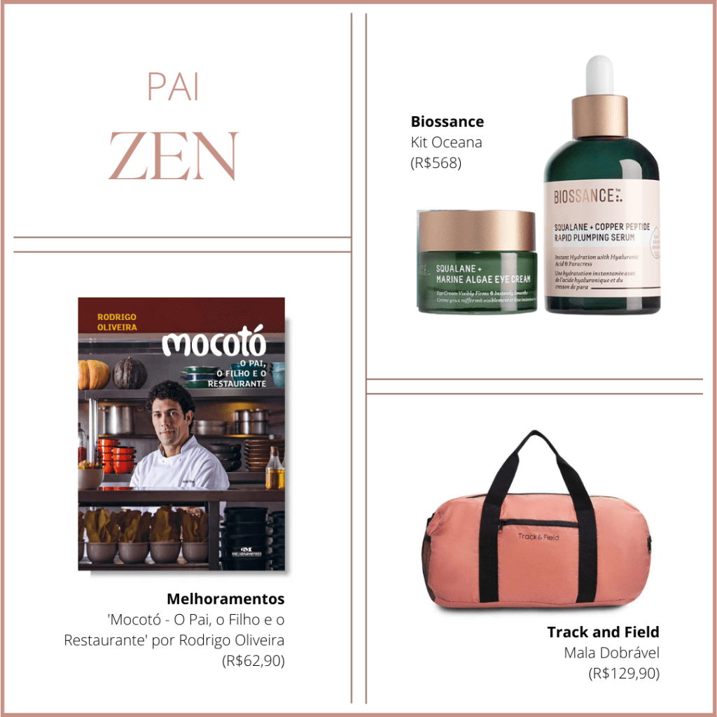 Para o Zen da família, opções que estimulem a tranquilidade são sempre boas. Que tal um kit de skincare, uma boa mala ou equipamento para ginástica ou um livro de receitas para cozinharem juntos?